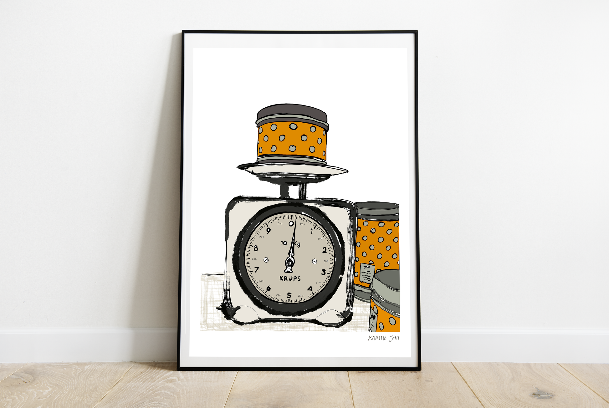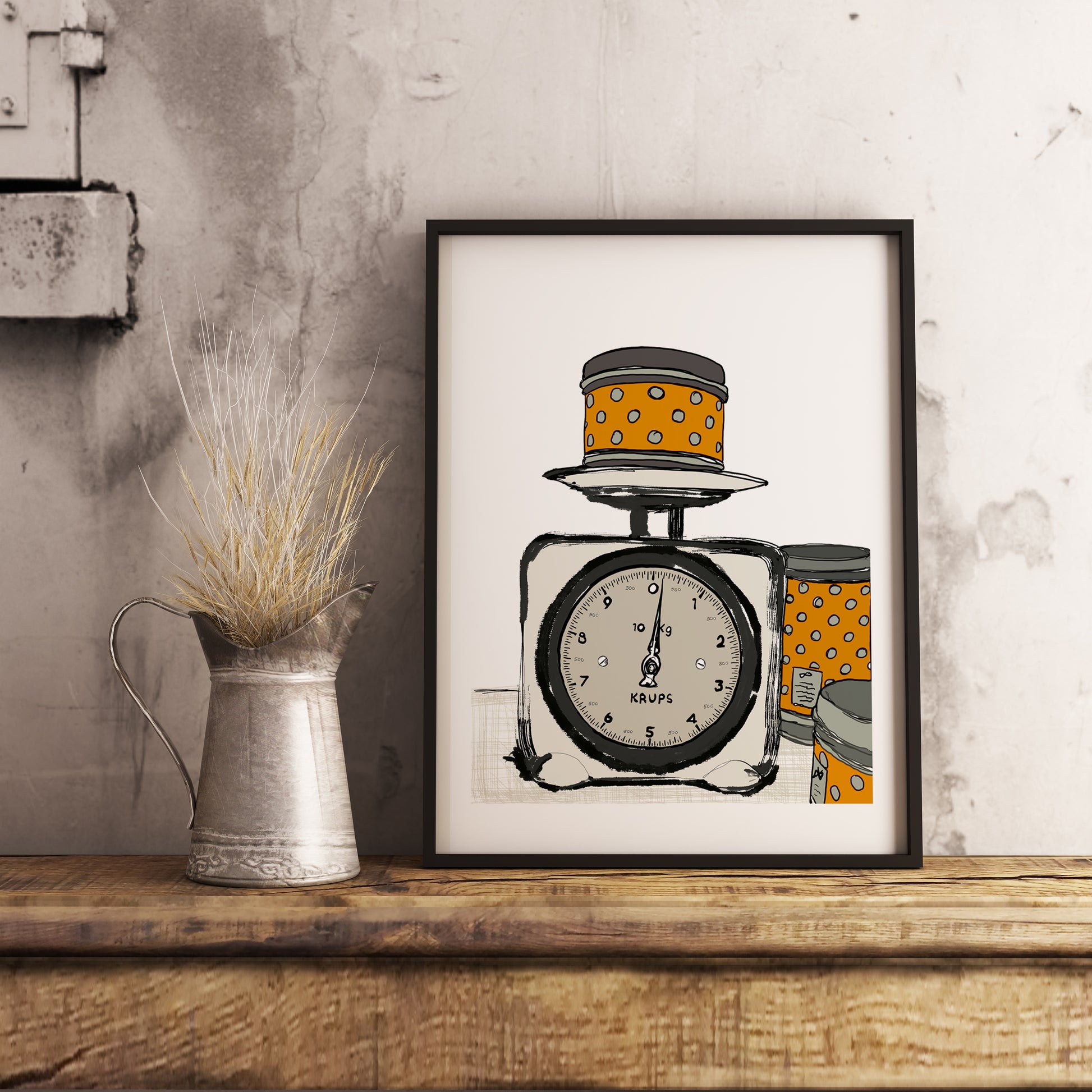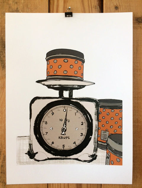 A drawing of vintage kitchen scale and containers in orange